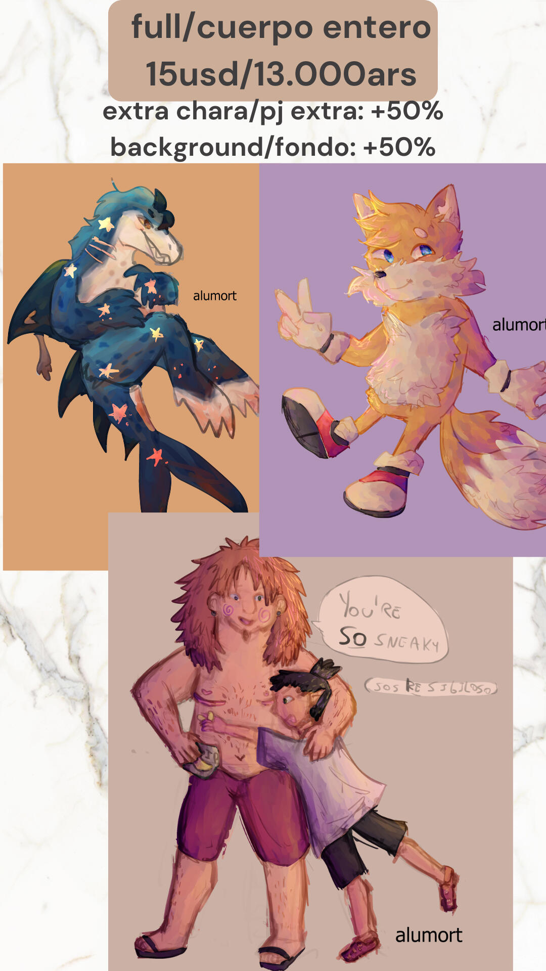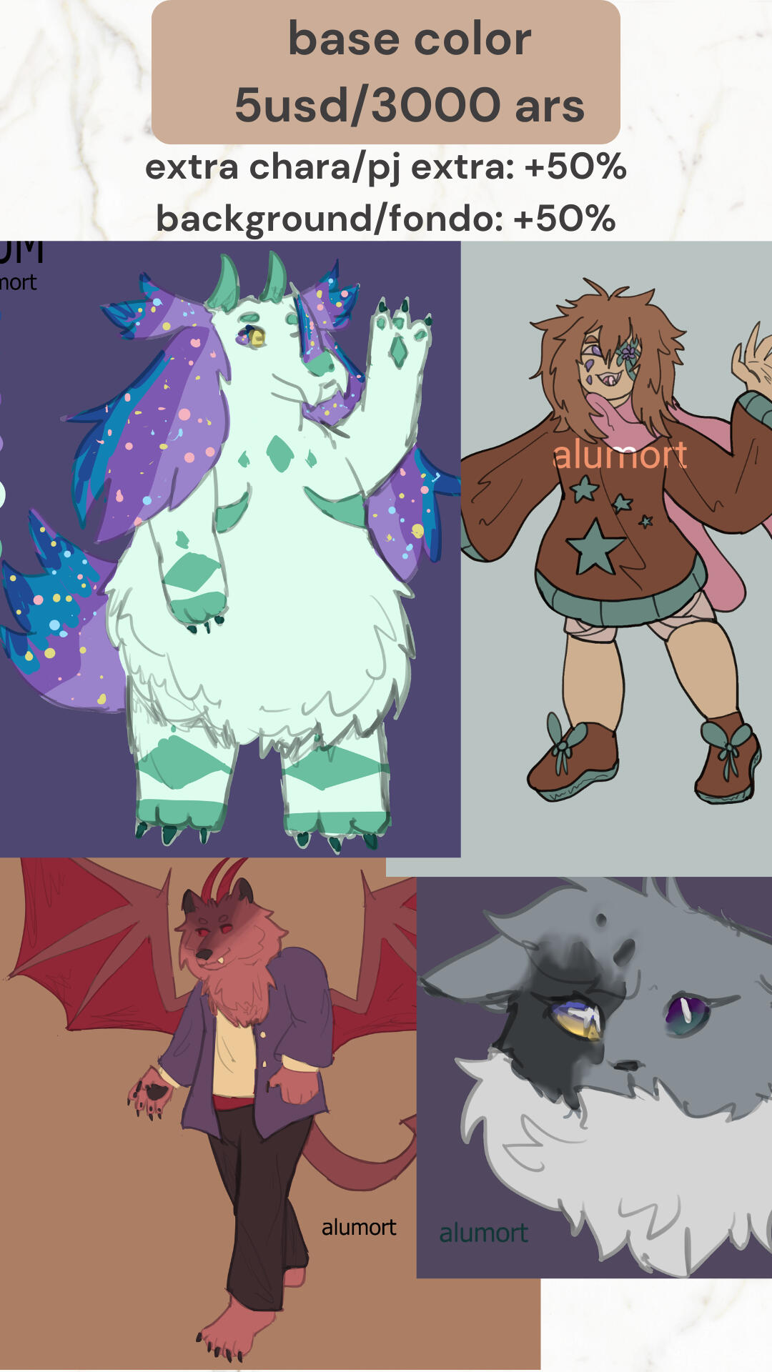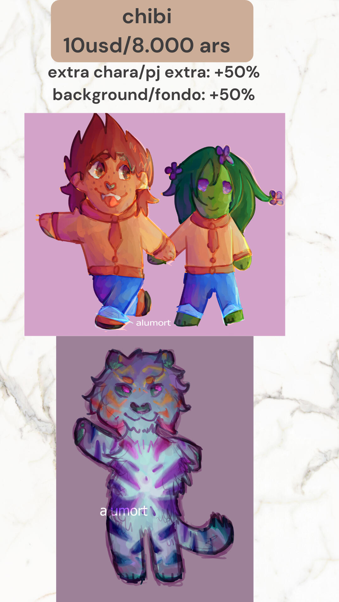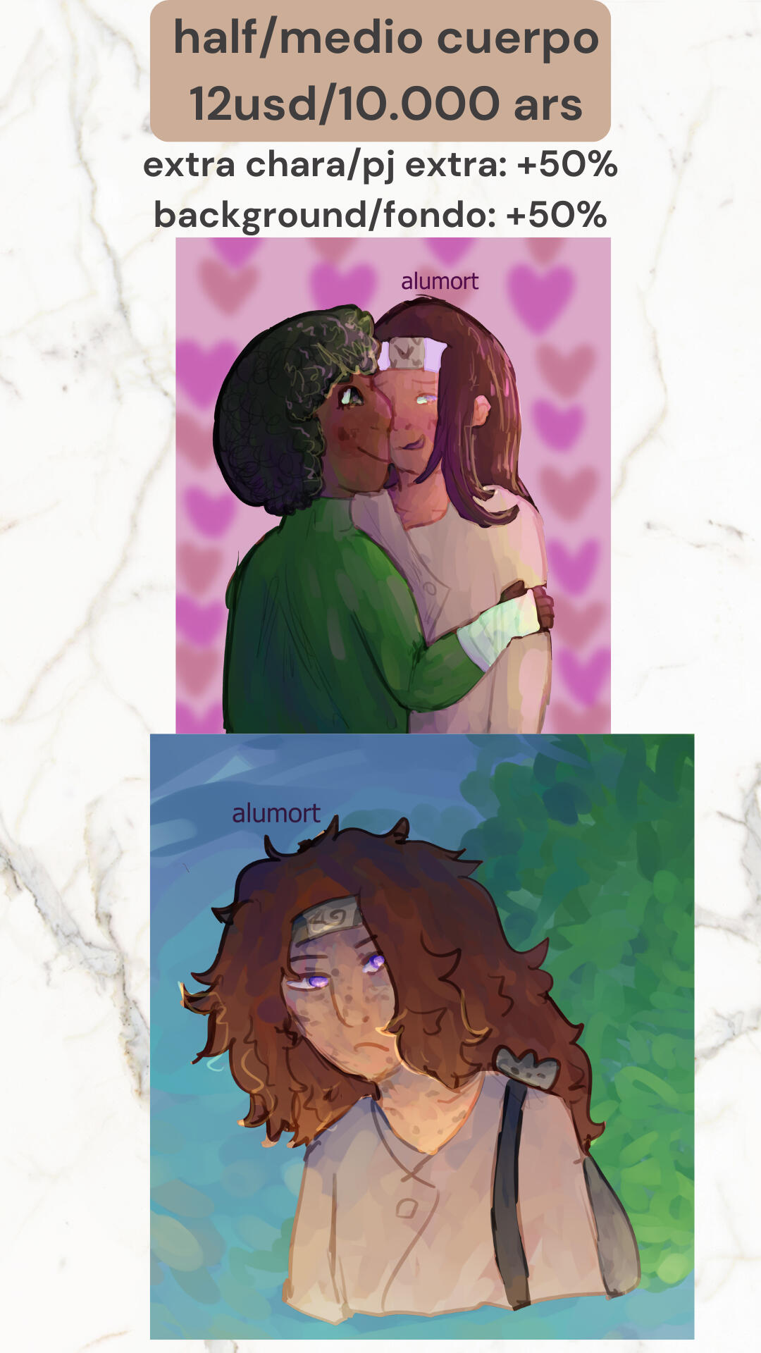 💸 Payment: Paypal Invoices, Ko-fi, Mercadopago (Argentina only)⏳ Turnaround: 1-2 weeks (depends on complexity, will update often)💌 Communication: discord (alumort) or inboxBackground: +50%Extra character: +50%Base color: 5usd