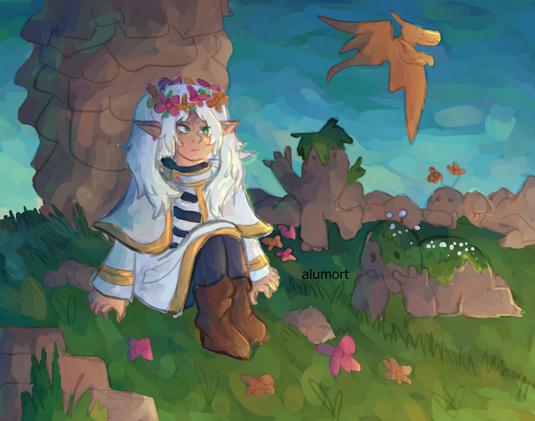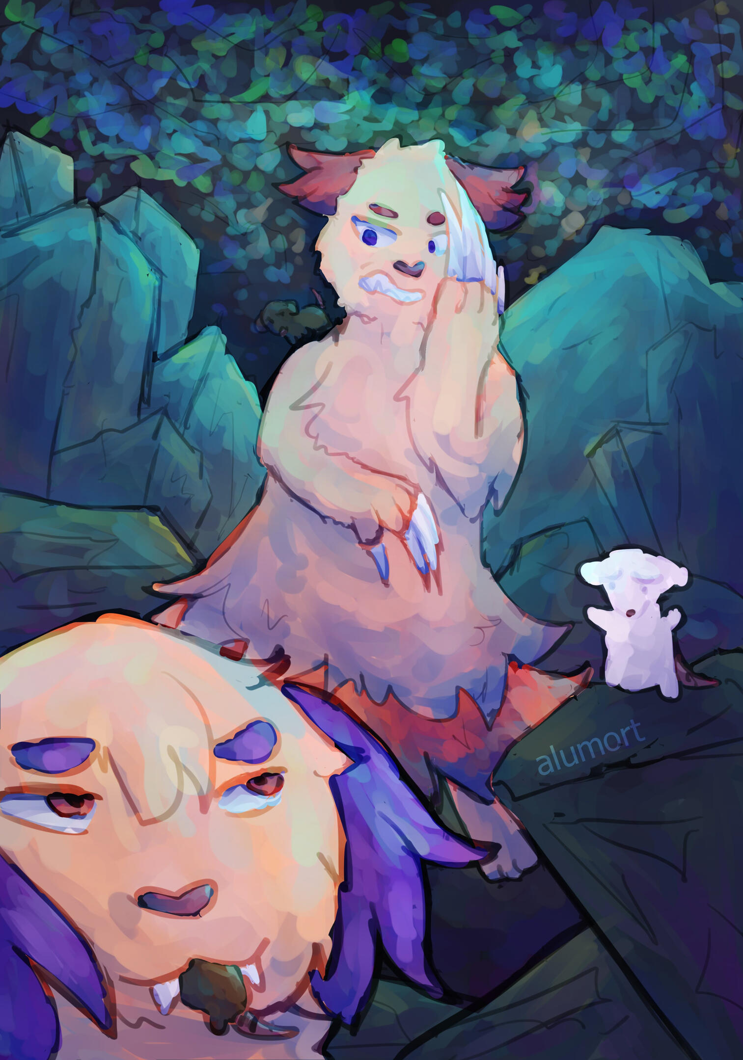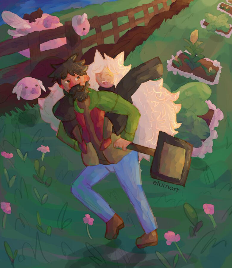 There was no trace in the sky of the sun anymore as the soft shine of the stars and the moon now illuminating the world through the dark, night taking over yet the bard was not afraid– its partner could see even without lights, and he always made sure to hold its hand on unmarked paths whenever its eyes weren’t enough. Another yawn escaped from their lips and soon the two of them got up, walking side to side towards the camp without saying much, stealing soft kisses from each other every now and then.