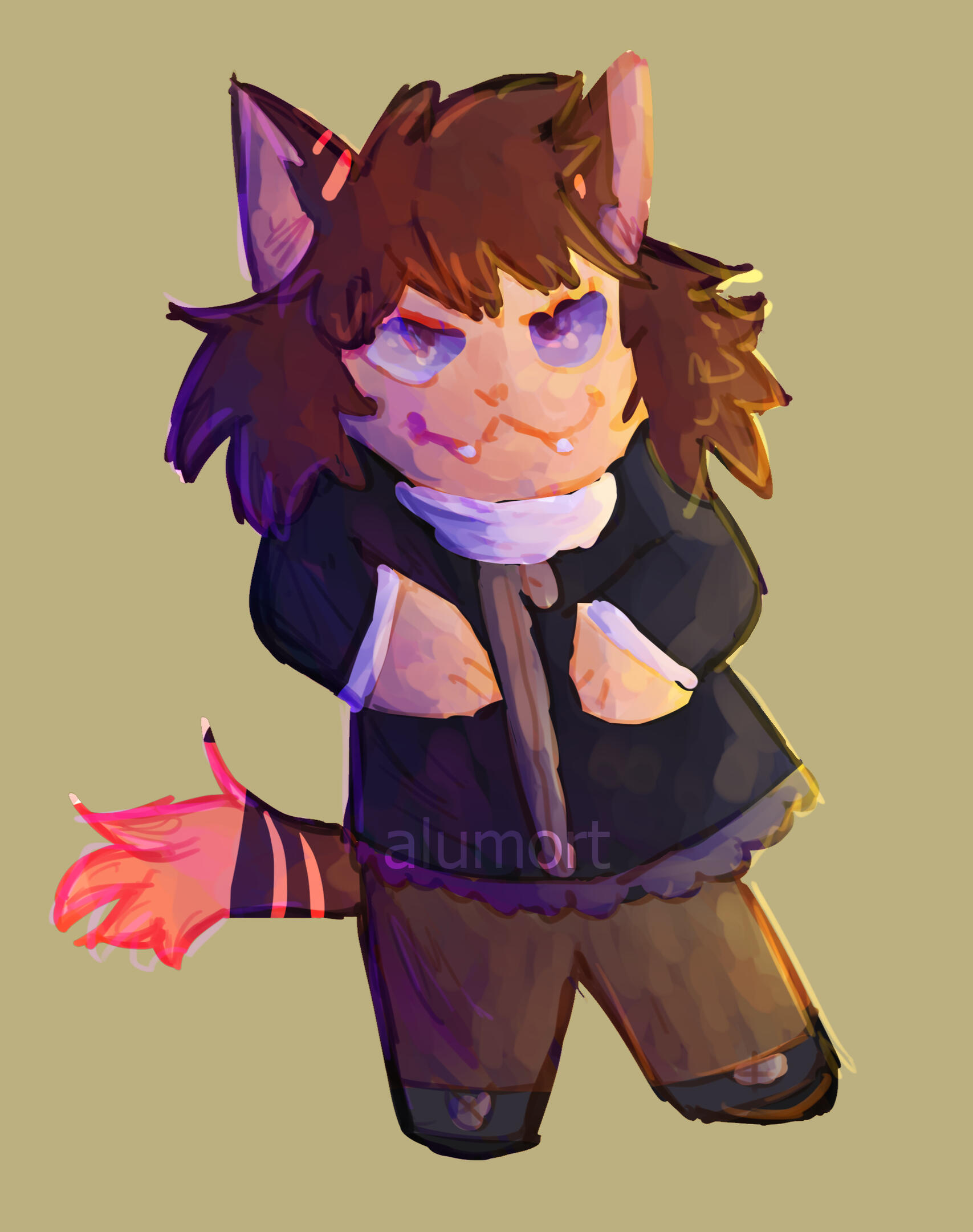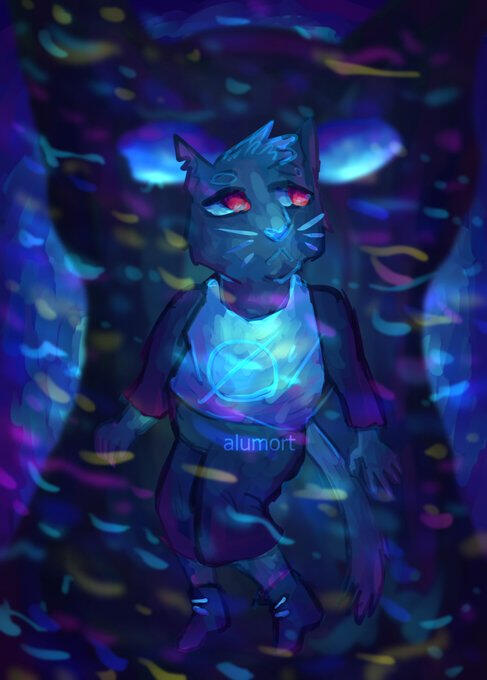Morta is an anthropomorphic cat with silver tabby fur, with blue eyes and no paw pads, and she’s usually seen wearing the upper half of a tuxedo. She’s an adult female who… obtains valuable possessions of people who don’t need them anymore for a living, by digging up abandoned graves who nobody but her knows about. It’s not wrong if nobody will care… and maybe she also takes things off graves that a little bird tells her hold even more interesting objects to sell.It’s not as easy as Morta makes it seem, though. Sometimes, the corpses she finds underneath the ground aren’t fully dead– zombies are fiercely protective creatures even when their brains are rotten, and Morta ended up with damage in her right eye and in her tail. She wears a black eyepatch and a bandage to cover each individual injury, not willing to accidentally hurt herself again and hiding them from prying eyes.Morta is a playful cat, always eager to find new treasures in graveyards and hidden tombs. She likes making jokes and goofing off, but she's easily frustrated whenever whatever she unburies doesn't have anything but old bones.Her favorite things in the world are a good coffee cup and anything that sparkles, and many have called her a magpie due to her tastes– sometimes, Morta doesn't sell all her findings, keeping a couple of them for her personal collection for only her to admire. Necklaces, crystals; anything that shines and you can name, Morta keeps it.Not everything is good for her, though. In her countless adventures and 'work trips', Morta faces extreme danger– and not only her tail and eye have suffered. A werecat curse spreaded through her veins, forcing her to turn into an extremely vicious version of herself whenever a full moon shines through the sky; two saber-like canine fangs appear from her mouth whenever this transformation takes place, her eye becomes red and her height becomes around 9 feet.To say that it's hard to control would be an understatement. Morta keeps no memories of these episodes, turning into an aggressive creature who will strike with no provocation at all, leaving only a trail of blood in her fur as evidence of her shenanigans.It was yet another secret she had to keep hidden from everyone, deciding to simply hang out in graveyards in order to avoid being seen by anybody. Perhaps, in a distant future, Morta will be able to speak about her mysteries with someone– but for now, only the dead will know.